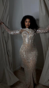 La coupe de la robe, fluide et majestueuse, épouse parfaitement vos formes, tandis que la brillance des cristaux ajoute une dimension spectaculaire à votre tenue, idéale pour des occasions prestigieuses.